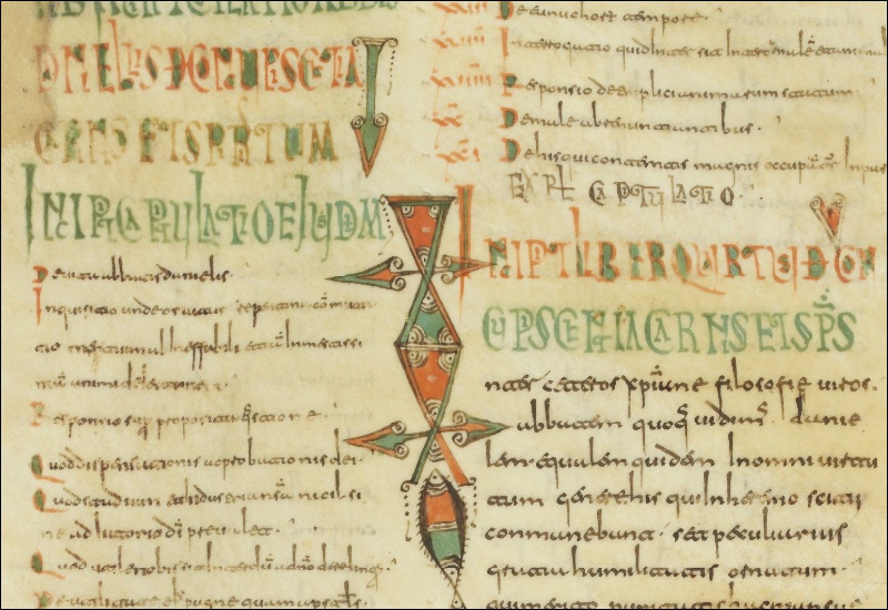 Collationes Patrum: This part of the manuscript contains a number of small decorative initials or litterae notabiliores in green, yellow and red as part of incipit and explicit. Seem that their style slightly changes between hands, especially between the first two and the third one, less elaborated. In some of these initials, small figures were added within; especially in those corresponding to the third hand.